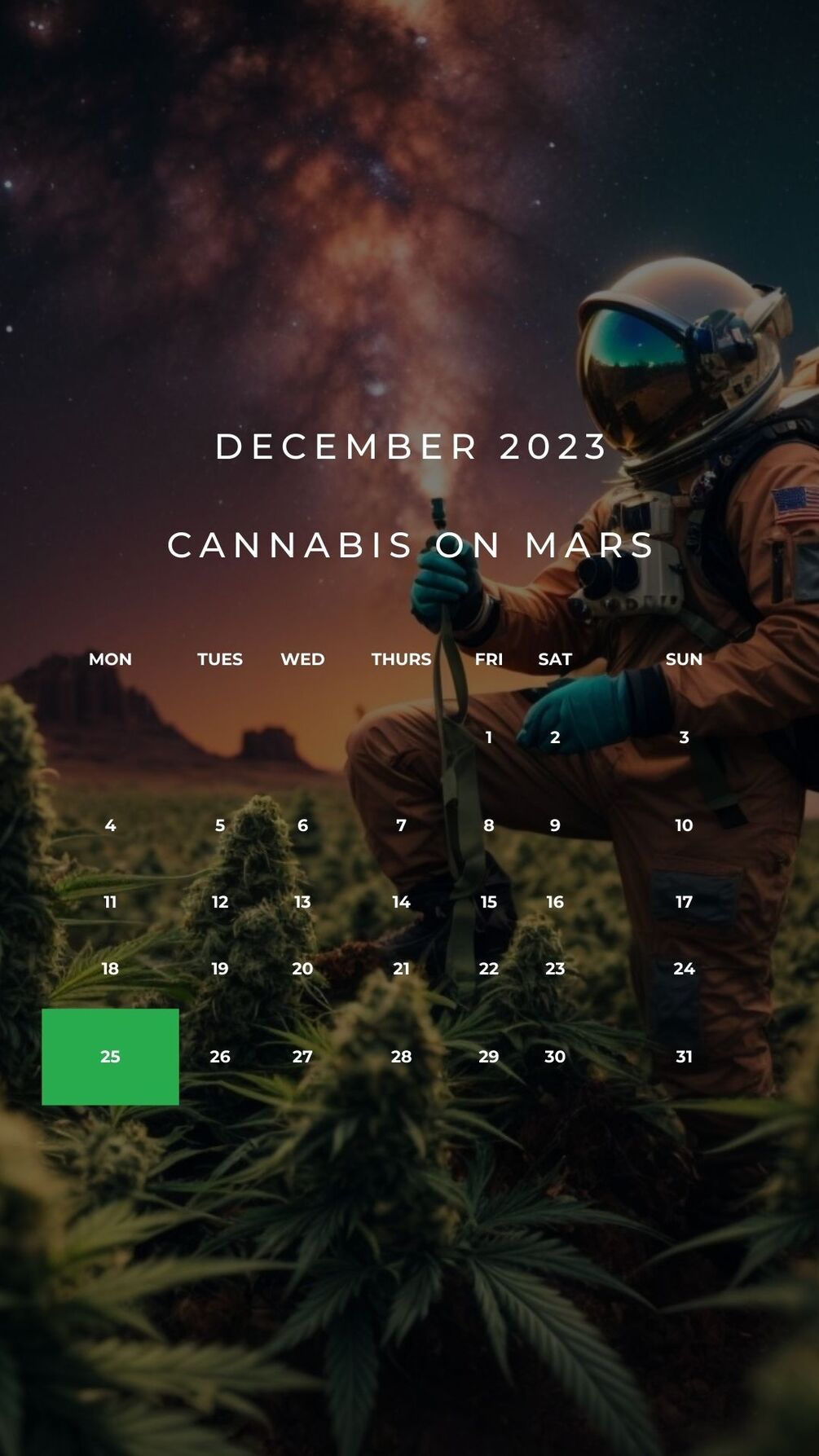 You’ll get a instant download of this one of kind digital art photo, “Cannabis On Mars” along with December 2023 calendar